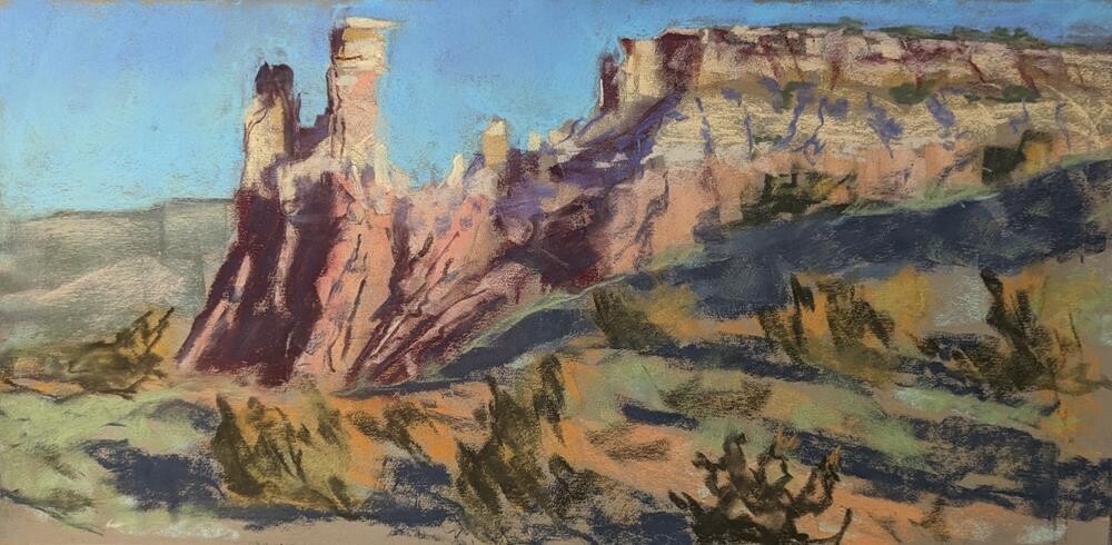 I got up super early one day at Ghost Ranch and hiked most of the way to Chimney Rock. I found this great spot on the way there and sat down and made this plein air pastel painting. I got up super early one day at Ghost Ranch and hiked most of the way to Chimney Rock. I found this great spot on the way there and sat down and made this plein air pastel painting. |