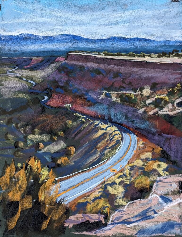 On Thanksgiving I walked out to Meditation Point on the edge of Los Alamos (so far on the edge town it's in Santa Fe county!) I brought a full sheet of pastel paper and made a nice big plein air painting on a pleasant late fall day. This area is my favorite place to plein air paint in Los Alamos, there's great views in all directions being on a very narrow end of the mesa. On Thanksgiving I walked out to Meditation Point on the edge of Los Alamos (so far on the edge town it's in Santa Fe county!) I brought a full sheet of pastel paper and made a nice big plein air painting on a pleasant late fall day. This area is my favorite place to plein air paint in Los Alamos, there's great views in all directions being on a very narrow end of the mesa. |