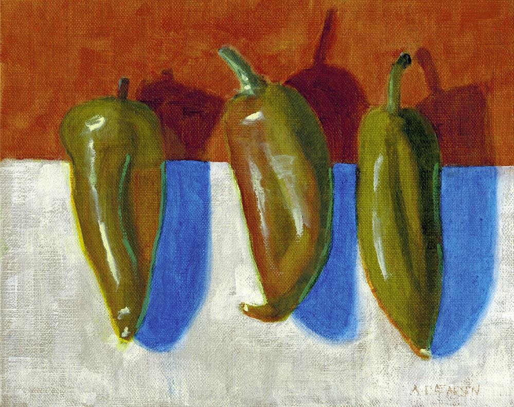 I love painting New Mexico chiles. Especially in groups of three! In this one I was inspired by Wayne Thiebaud's bright ultramarine shadows in his still life paintings. I love painting New Mexico chiles. Especially in groups of three! In this one I was inspired by Wayne Thiebaud's bright ultramarine shadows in his still life paintings. |